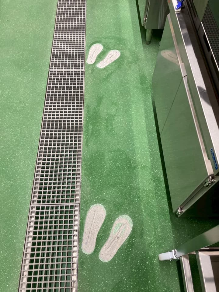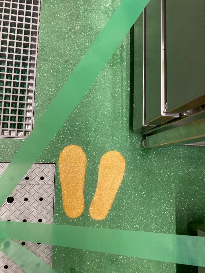 千葉県にあるスーパー様の厨房にて、足形塗り(ミルクリートMMイエロー仕上げ)を施工しました。明るいイエローで、足元が分かりやすい作業環境を実現しました。