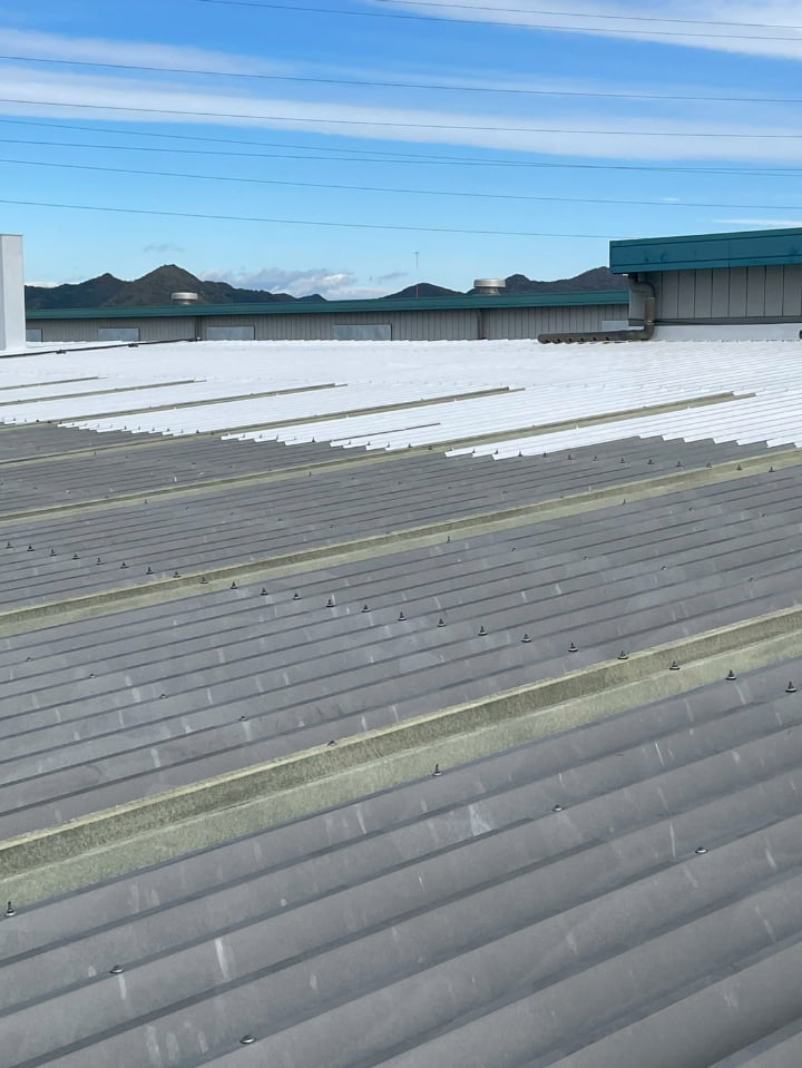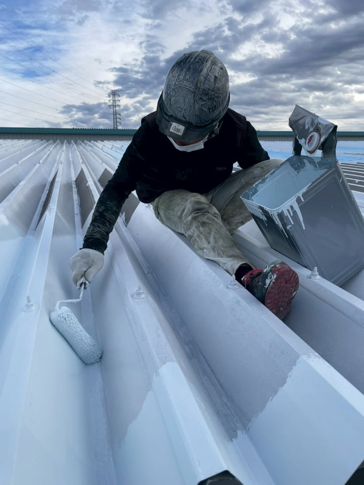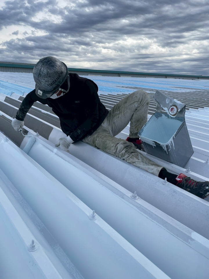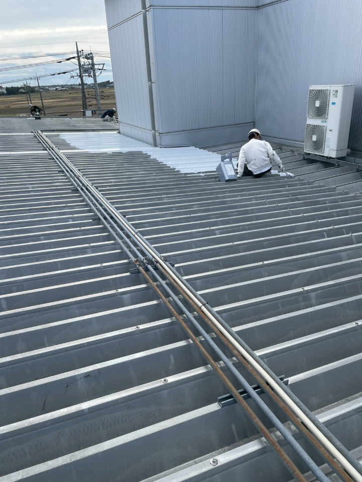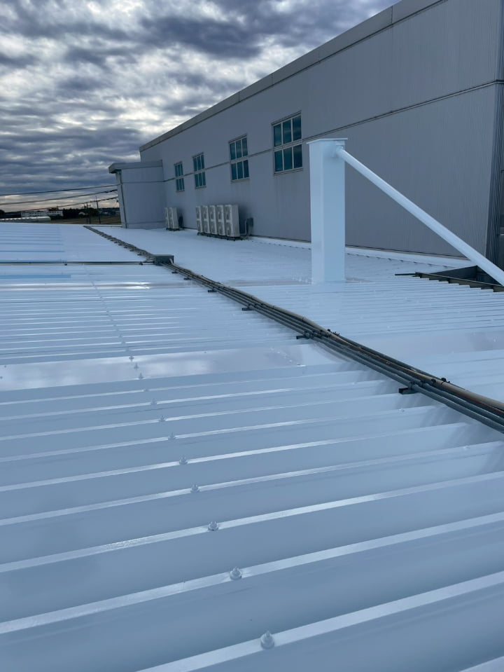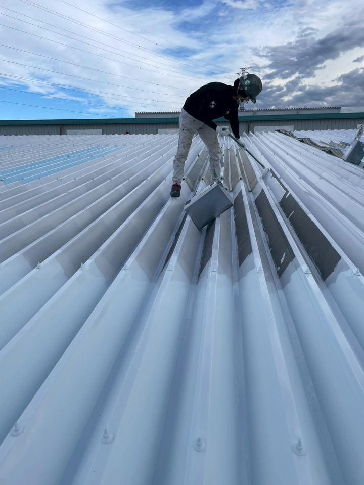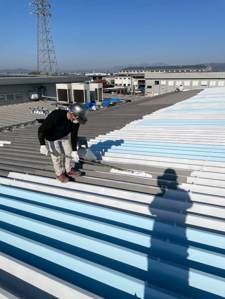 群馬県にある工場様にて、屋根の遮熱塗装を実施しました。高い遮熱効果を持つ「アトム遮熱バリアルーフ」を採用し、屋根表面温度の上昇を防ぎ、空調負荷に貢献します。